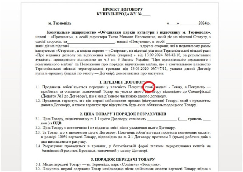 Продають цапа на підставі рішення Тернопільської міської ради «Про надання дозволу на відчуження майна (тварин)». Власником тварини поки є КП «Об'єднання парків культури і відпочинку м. Тернополя».