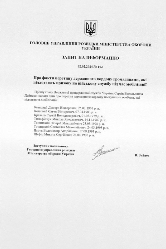 Зокрема, заступник голови ГУР Ігор Остапенко збирав дані про статус у рамках призову (резервіст, військовозобов'язаний чи ухилист) близьких Єрмака та родичів високопосадовців із його оточення. Під запитом до Генштабу ЗСУ стоїть його підпис.