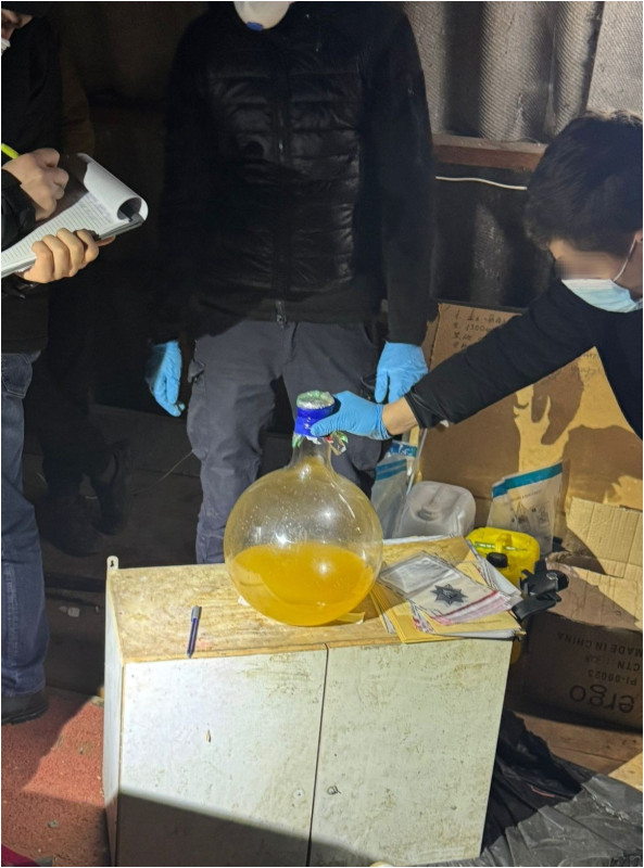 Правоохоронці вилучили нарковмісні сировини, засоби для нагрівання, колби для варіння та відстоювання, лабораторне обладнання, електронні ваги, оргтехніку, протигази, засоби індивідуального захисту тощо. Також у ділків конфіскували записники з чорновими записами та рецептами варіння наркотиків, мобільні телефони, грошові кошти за збут наркотичних засобів та транспортний засіб, який використовували у злочинній діяльності.