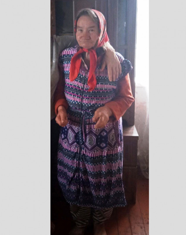 Была одета: в халат (см. фото), куртку желтого цвета, брюки темного цвета, коричневые ботинки.