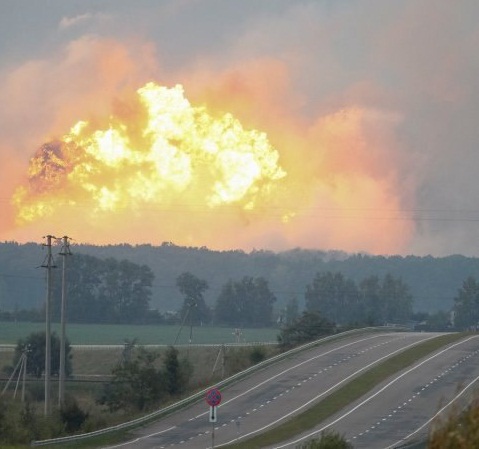 Как сообщают источники, сегодня в ночное время в Черниговской области, в населенном пункте Ичня начали взрываться склады боеприпасов. Во многих домах, школе и сельсовете от взрывов вылетели окна. Взрывами повреждено 5 жилых домов. Пострадавших от взрывов и пожара, по имеющейся на данный момент информации, нет.