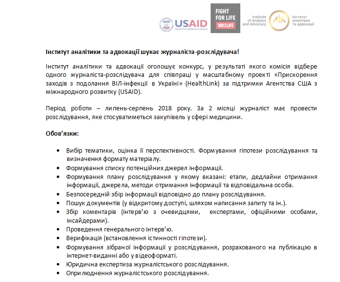"Інститут аналітики та адвокації оголошує конкурс, у результаті якого комісія відбере одного журналіста-розслідувача для співпраці у масштабному проекті «Прискорення заходів з подолання ВІЛ-інфекції в Україні» (HealthLink) за підтримки Агентства США з міжнародного розвитку (USAID). Період роботи – липень-серпень 2018 року. За 2 місяці журналіст має провести розслідування, яке стосуватиметься закупівель у сфері медицини. ", — заявивли в институте.