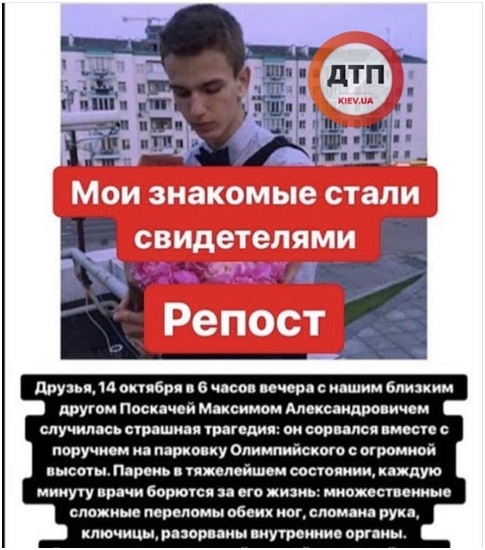 Итак, начали. То о чем мы предупреждали: на Олимпийском парень сорвался с высоты, в критическом состоянии.