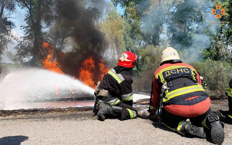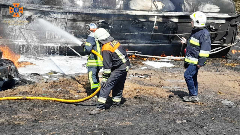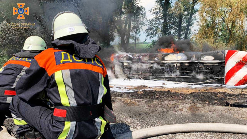Як повідомляють джерела, вантажний автомобіль – бензовоз з невідомої причини з’їхав з проїжджої частини в кювет, де перекинувся та загорівся. Прибувши на місце, рятувальники негайно розпочали ліквідацію займання.