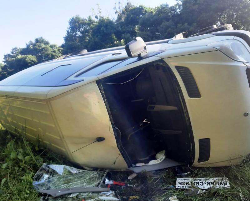 Як повідомляють джерела, водій мікроавтобуса маршрутного таксі застосував екстрене гальмування, щоб уникнути наїзду на собаку, який раптово вискочив на проїжджу частину. В цей момент у мікроавтобус врізався вантажний автомобіль, який рухався позаду – від удару маршрутка перекинулось.