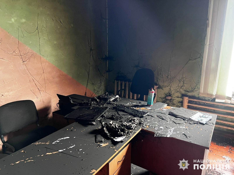 Як повідомляють джерела, було встановлено, що мав місце умисний підпал робочого місця керівника освітнього закладу. Також невідомі зловмисники влаштували розгром, потрощивши меблі та техніку.