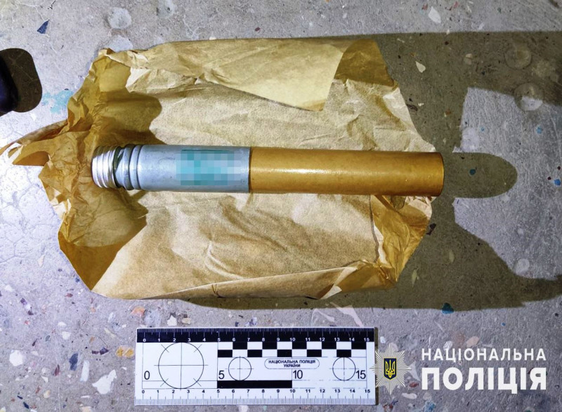 Прибувши на місце події, правоохоронці оглянули імпровізований схрон, облаштований у підсобному приміщенні між шостим та сьомим поверхами будинку, вилучили з нього та доправили на експертизу: