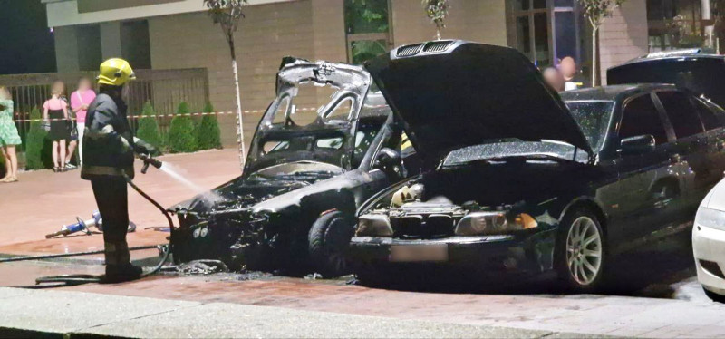 Як повідомляють джерела, прибувши на місце події, рятувальники встановили, що займання, яке виникло у легковому автомобілі Audi, швидко перекинулось на припарковані поряд автомобілі BMW та Mazda, і негайно розпочали ліквідацію пожежі.