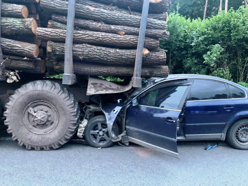 Як повідомляють джерела, з невстановленої на даний момент причини водій автомобіля Volkswagen допустив зіткнення з вантажівкою, яка перевозила деревину.