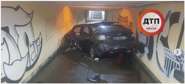 Сегодня в утреннее время в Киеве автомобиль Mazda на высокой скорости въехал в подземный переход, где залил всё бензином. Вот что стало известно изданию «Криминал»