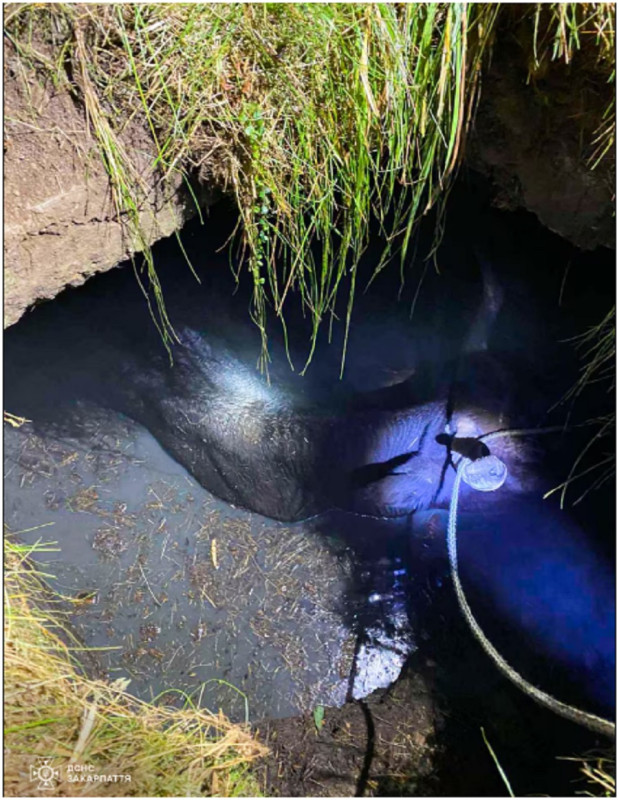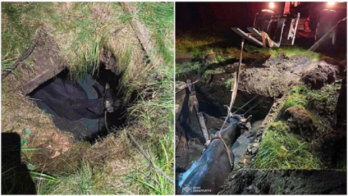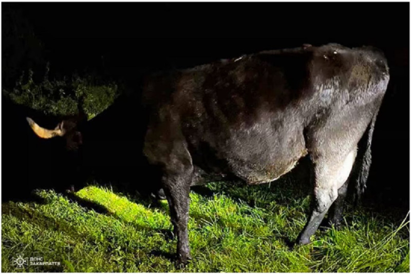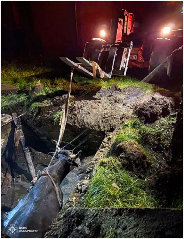 Як повідомляє ДСНС Закарпаття, у селі Пилипець корова не помітила в темряві яму й опинилася в пастці. Щоб врятувати тварину, господарям довелося викликати рятувальників.