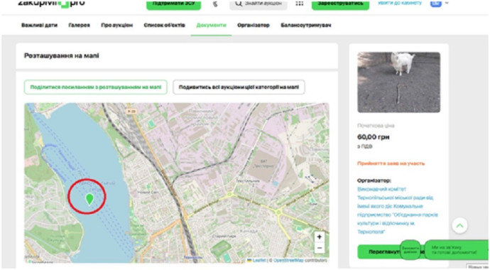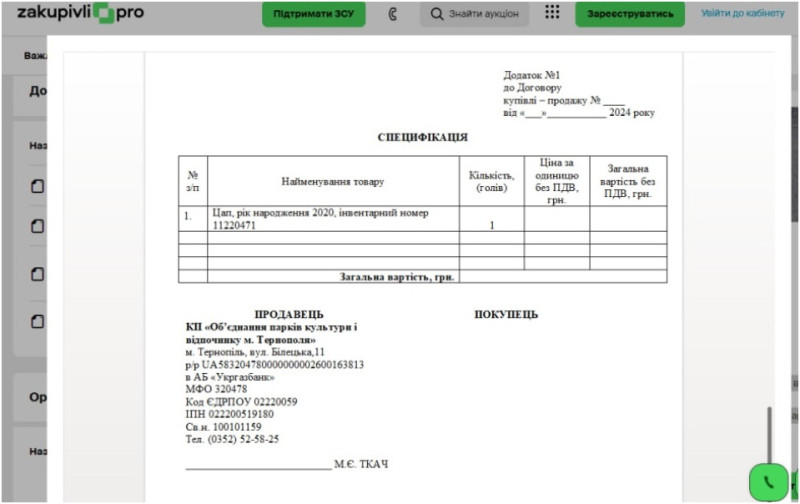 Виконавчий комітет Тернопільської міської ради від імені якого діє КП «Об'єднання парків культури і відпочинку м. Тернополя» виставив на аукціон цапа. Стартова ціна за «лот» 60 гривень. Інформація про продаж тварини з'явилася на сайті zakupivli.pro.