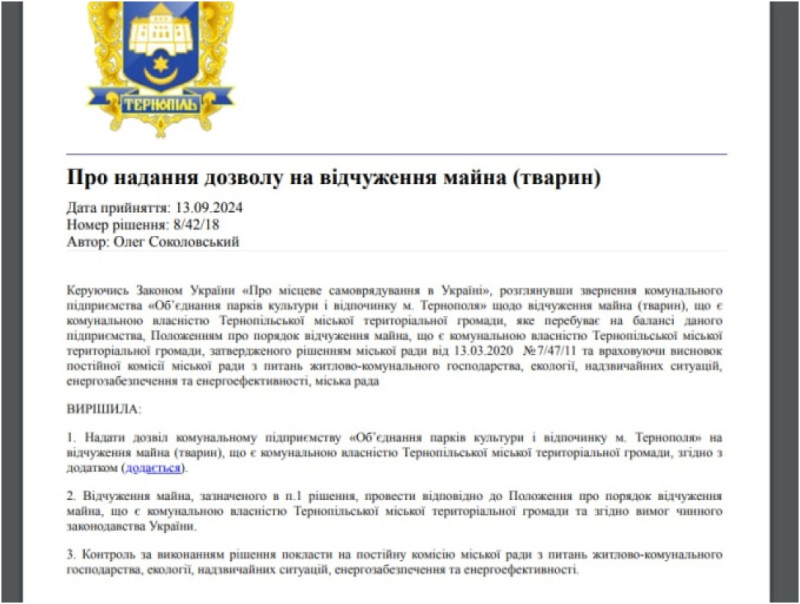 Продають цапа на підставі рішення Тернопільської міської ради «Про надання дозволу на відчуження майна (тварин)». Власником тварини поки є КП «Об'єднання парків культури і відпочинку м. Тернополя».