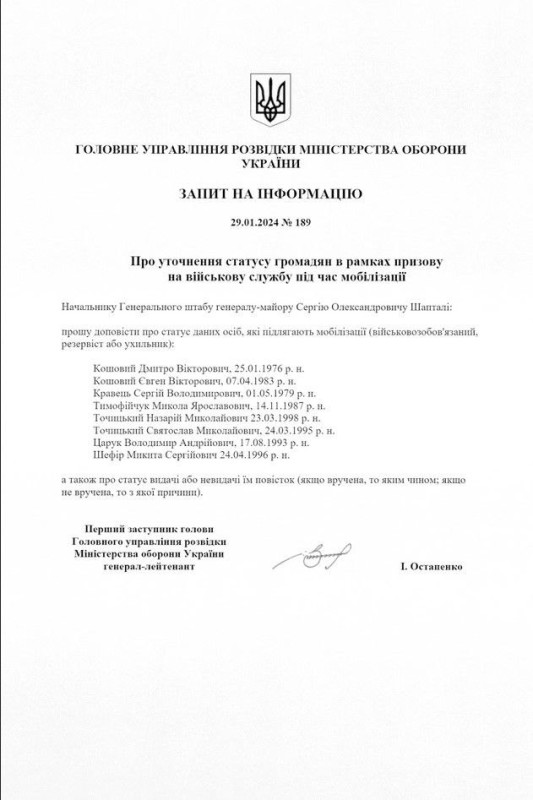 Зокрема, заступник голови ГУР Ігор Остапенко збирав дані про статус у рамках призову (резервіст, військовозобов'язаний чи ухилист) близьких Єрмака та родичів високопосадовців із його оточення. Під запитом до Генштабу ЗСУ стоїть його підпис.