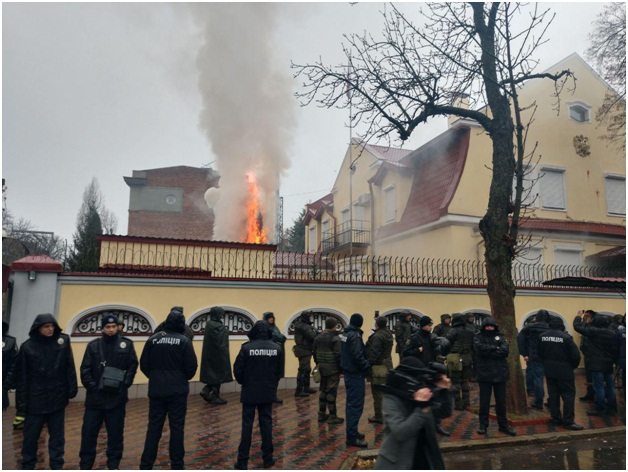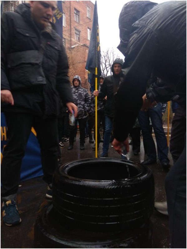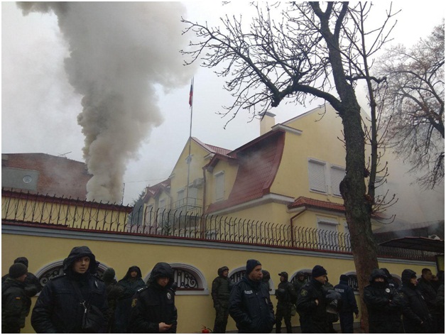 Перед зданием сожгли флаг РФ. Также здание забросали фаерами и яйцами. Из-за фаера загорелась одна из туй на территории консульства. Активисты принесли две шины, облили их ацетоном и пытались зажечь. Представители правоохранительных органов погасили шины.