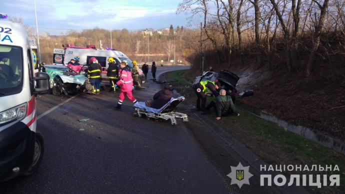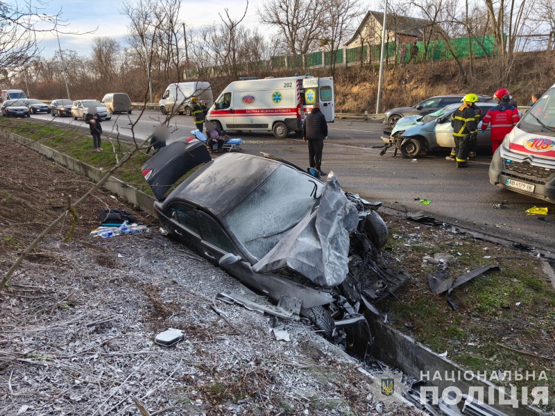 За попередньою інформацією слідства, BMW після зіткнення з Hyundai з'їхав на узбіччя та спалахнув. 38-річну водійку Hyundai та 61-річних водія та пасажирку BMW оглянули лікарі. З Mercedes ніхто не постраждав.