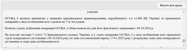 Суд кваліфікував його дії за ч. 4 ст. 408 КК України – дезертирство в умовах воєнного стану – та призначив покарання у вигляді 5 років позбавлення волі.