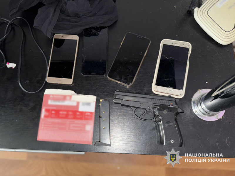 В ході санкціонованих обшуків у членів злочинної групи виявили та вилучили предмет, схожий на пістолет, страйкбольну гранату, набої, банківські картки та мобільні телефони.