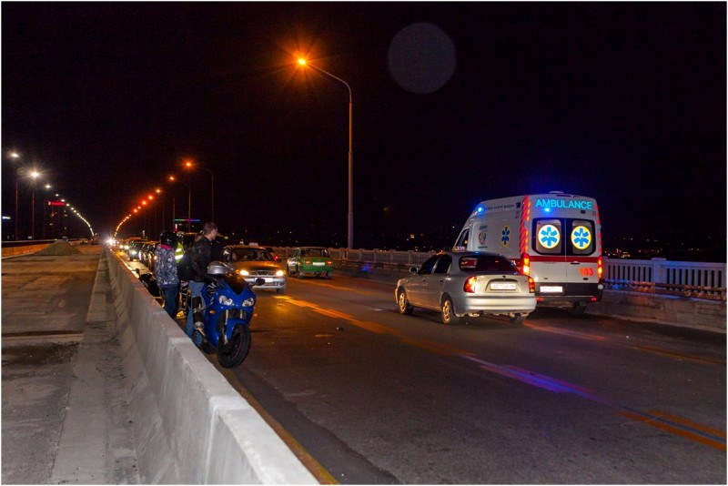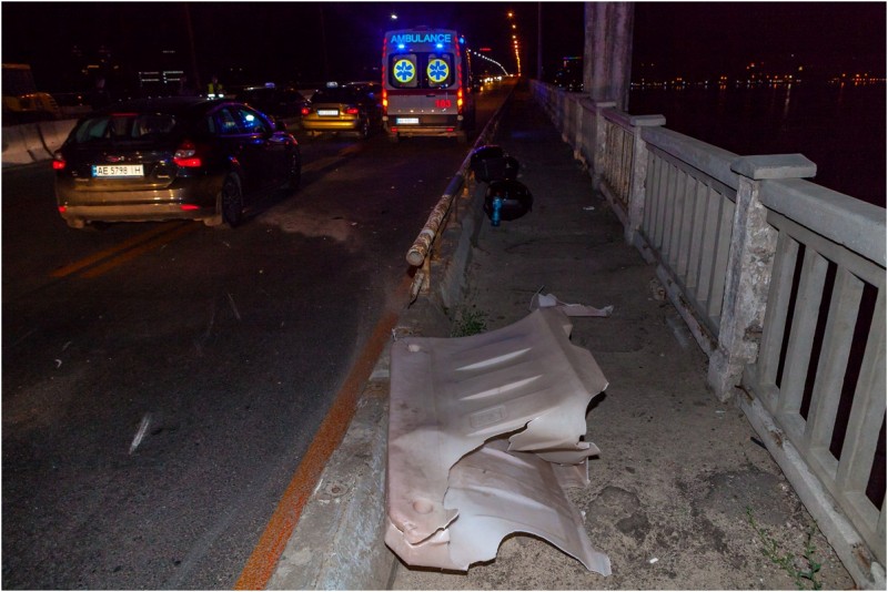 В ночное время на Новом мосту в Днепре произошло ДТП, в результате которого мотоциклист, следовавший в сторону левого берега, не заметил отбойник и перевернулся. В результате аварии на мосту было затруднено движение и образовалась пробка.