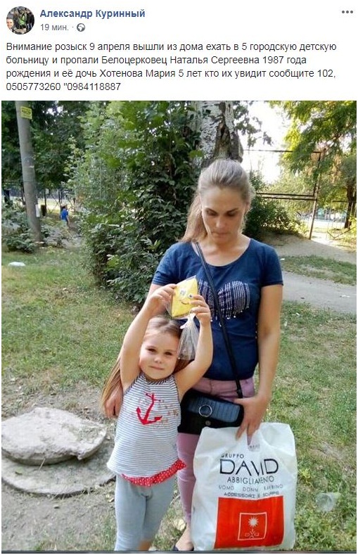 Всех, располагающих информацией о местонахождении Натальи Сергеевны Белоцерковец и её дочери Марии Хотеновой, просят сообщить по телефонам 050 577 32 60, 102 или в ближайшее отделение полиции.