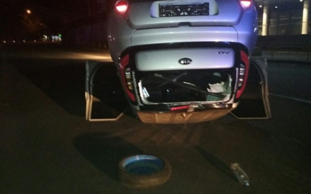 От удара при столкновении автомобиль KIA перевернулся на крышу.