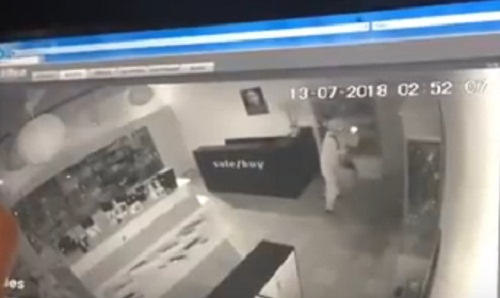 На записи с камеры наблюдения видно, как неустановленный мужчина проникнув в помещение магазина начинает забирать товары и пытается разбить ногой одну из витрин.