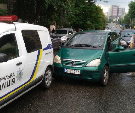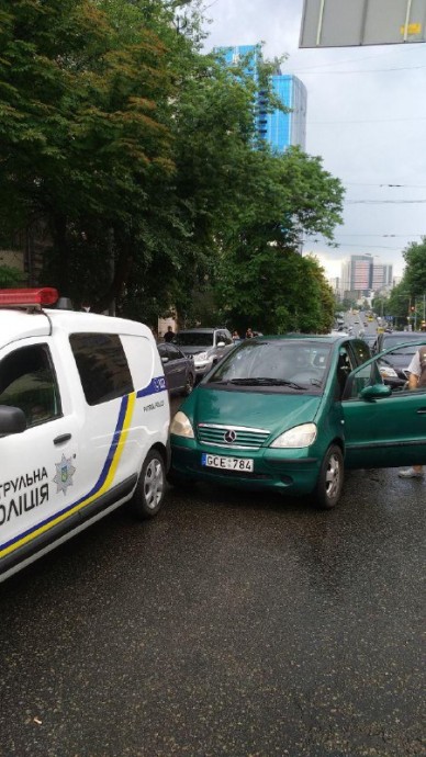 Сегодня, 19 июня 2018 года в центре Киеве автомобиль марки «Мерседес» на номерах Республики Латвия, устроил ДТП с участием автомобиля патрульной полиции.