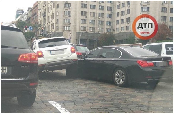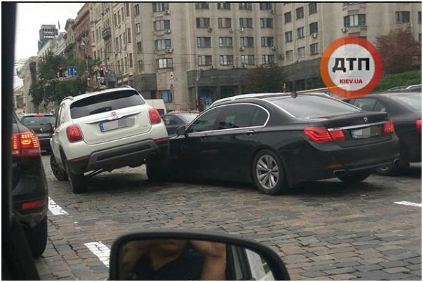 Сегодня в Киеве на Европейской площади произошло несколько необычное ДТП – из-за интенсивного движения и большого количества автомобилей в тесноте Honda«наехала» колесом на BMW.