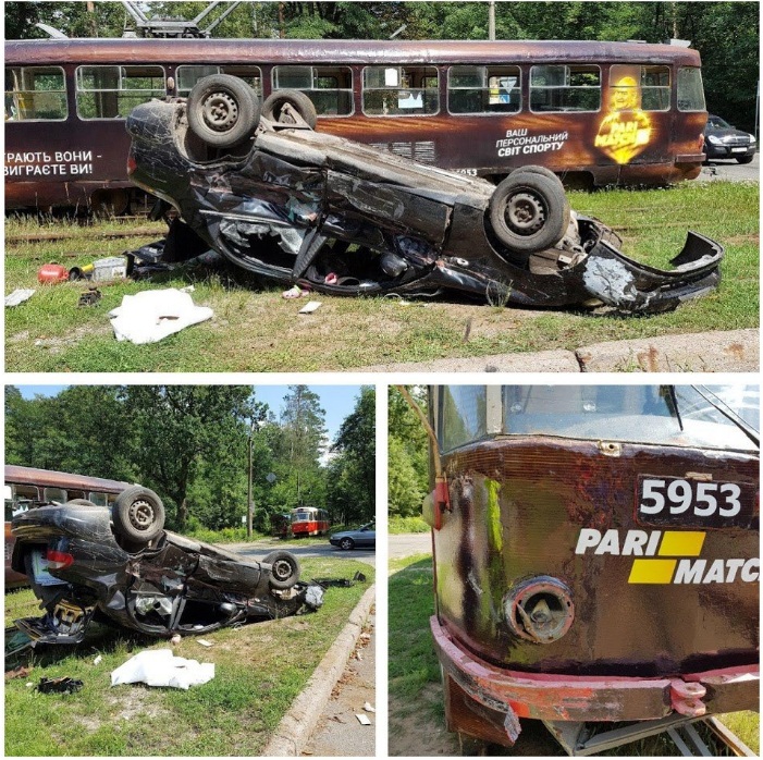 Сегодня в дневное время в Киеве автомобиль Lanos протаранил трамвай. В результате автомобиль опрокинулся и получил значительные повреждения. Трамвай получил незначительные деформации.