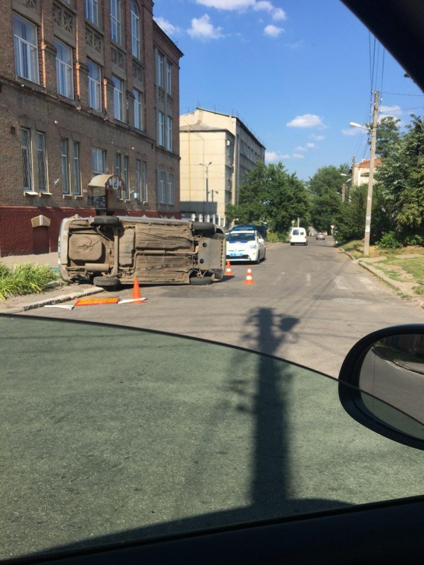 На улице Кондаурова в Харькове около 18 часов произошло ДТП в результате которого автомобиль перевернулся и так остался лежать, как сказали местные острословы, «загорать». На место происшествия прибыла полиция.