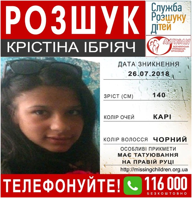 Разыскивается пропавшая 14-летняя Кристина Ибрияч. Известно, что 26 июля 2018 девушка ушла из дома в с. Довжик Черниговской области. До настоящего времени о девушке нет никаких известий.