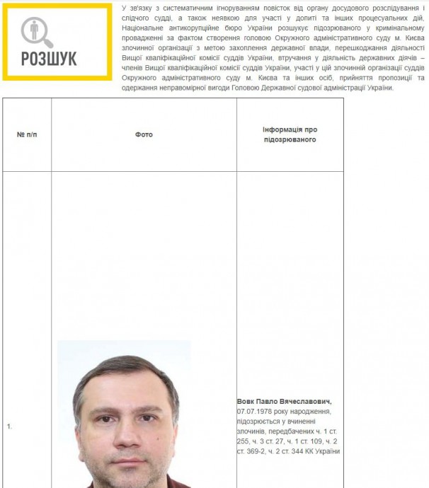 НАБУ объявило в розыск главу Окружного админсуда Киева Павла Вовка