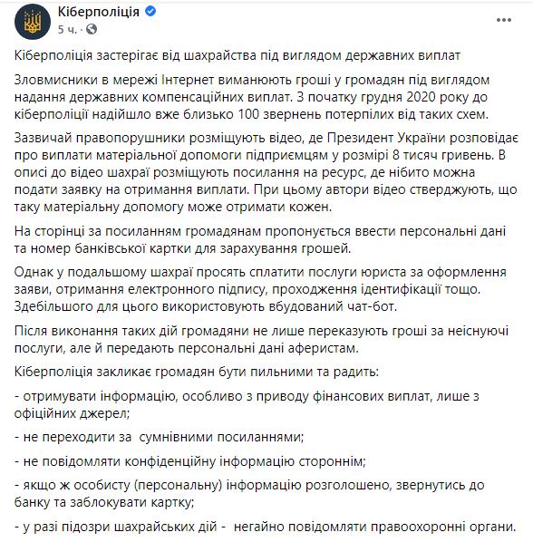 С начала декабря 2020 года в киберполицию поступило уже около 1000 обращений пострадавших от таких схем", — сказано в заявлении.