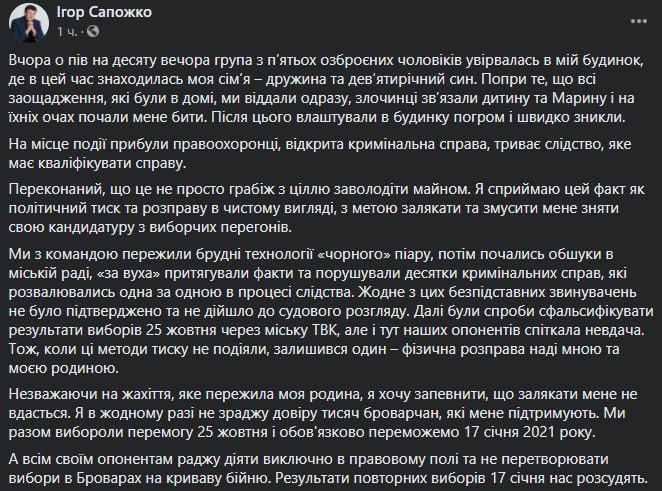 «Вчера в половине десятого вечера группа из пяти вооруженных мужчин ворвалась в мой дом, где в это время находилась моя семья — жена и девятилетний сын. Об этом сегодня, 22.12.2020 сообщает издание «Криминал Нет».