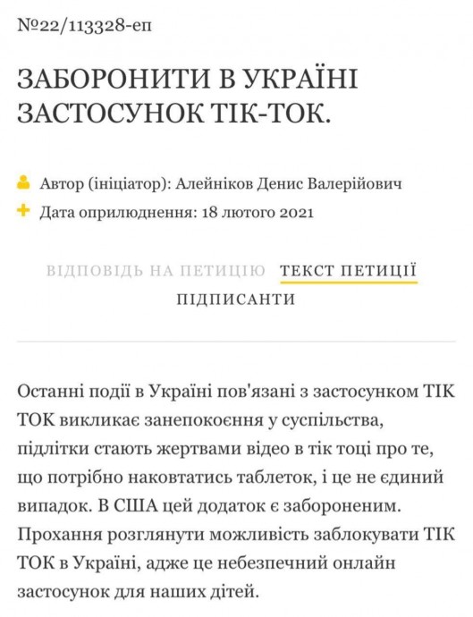 В нескольких школах под Киевом уже собрали более 10000 подписей от учителей и родителей о запрете соцесети. На сайте президента также появилась соответствующая петиция. Её автор требует запретить TikTok, так как он подстрекает детей наносить вред своему здоровью. Об этом сегодня, 20.02.2021 сообщает издание «Криминал Нет».