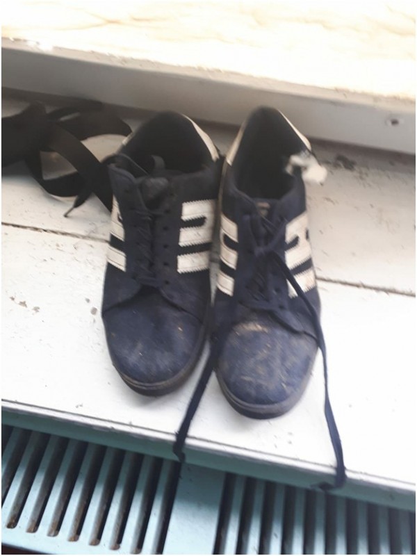 Был одет в спортивные штаны серого цвета, синюю футболку, кеды 41 размера синего цвета с белыми вставками.