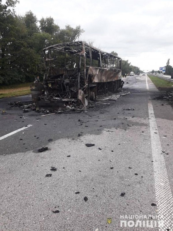 В результате столкновения автобус загорелся.