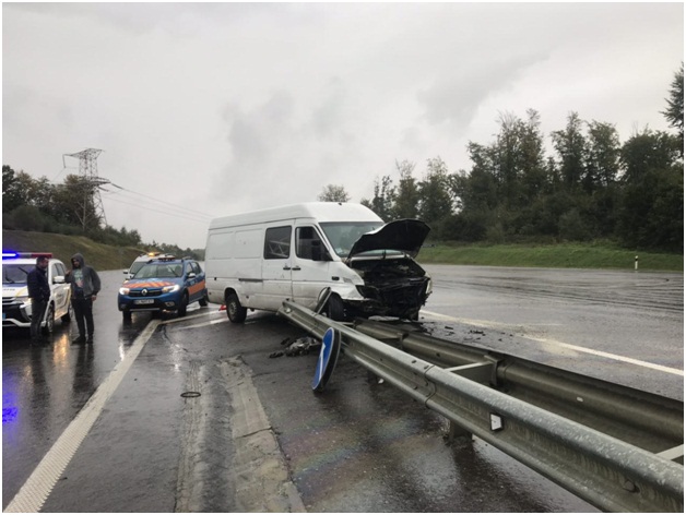 Mercedes Sprinte правой стороной ударил Ford в левую сторону и микроавтобус влетел в отбойник.