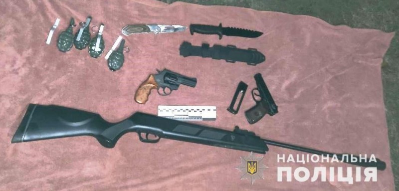 В ходе проведения неотложного обыска по месту проживания задержанного были обнаружены, изъяты и направлены для проведения экспертизы: предмет, похожий на гранату Ф-1; рычаг к детонатору типа УЗРГМ; пневматическая винтовка; пневматический пистолет; пистолет типа «Флобер» с патронами и стрелянными гильзами; 4 пластиковых предмета, похожих на гранаты.
